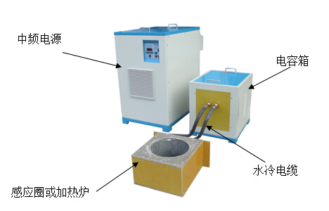 常規(guī)情況下,雙平提供的中頻電源、電容箱和加熱爐如下圖所示。中頻電源和電容箱之間采用同軸電纜連接,電容箱與感應圈間采用水冷電纜連接。